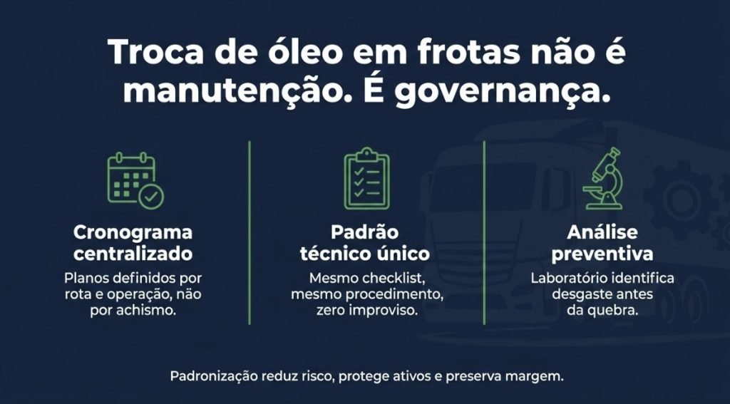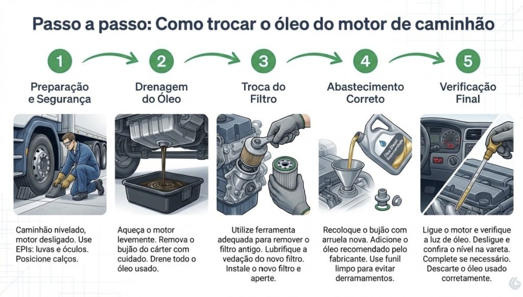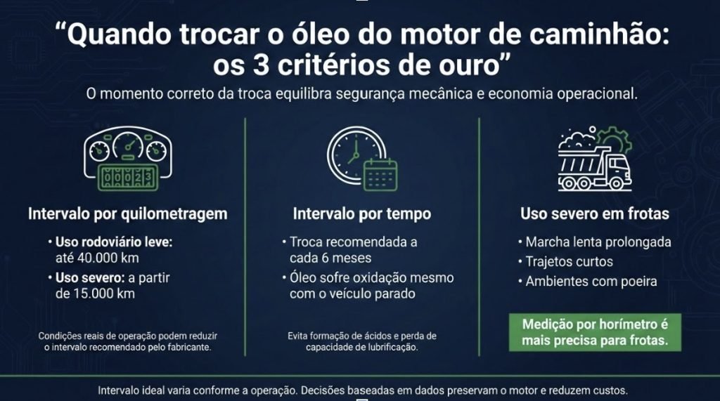 Lembre-se: o intervalo ideal para troca de óleo de caminhão varia entre 15.000 km (uso severo) e 40.000 km (uso rodoviário leve), ou a cada 6 meses. A medição por horas de motor (horímetro) é a mais precisa para frotas pesadas.